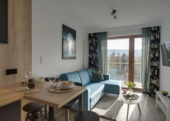 Trevilles Apartamenty Nice View ferielejlighed ligger omkring 3 km fra Szklarka Waterfall og byder på udsigt over bjerget. Det består af 1 soveværelser, 1 badeværelser og et tekøkken.
